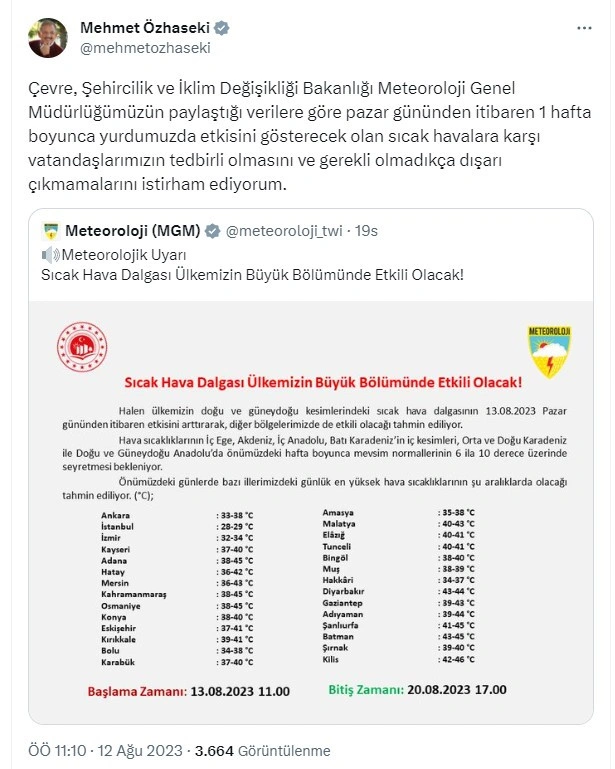 Bakan Özhaseki paylaşımında, “Çevre, Şehircilik ve İklim Değişikliği Bakanlığı Meteoroloji Genel Müdürlüğümüzün paylaştığı verilere göre pazar gününden itibaren 1 hafta boyunca yurdumuzda etkisini gösterecek olan sıcak havalara karşı vatandaşlarımızın tedbirli olmasını ve gerekli olmadıkça dışarı çıkmamalarını istirham ediyorum” ifadelerini kullandı.