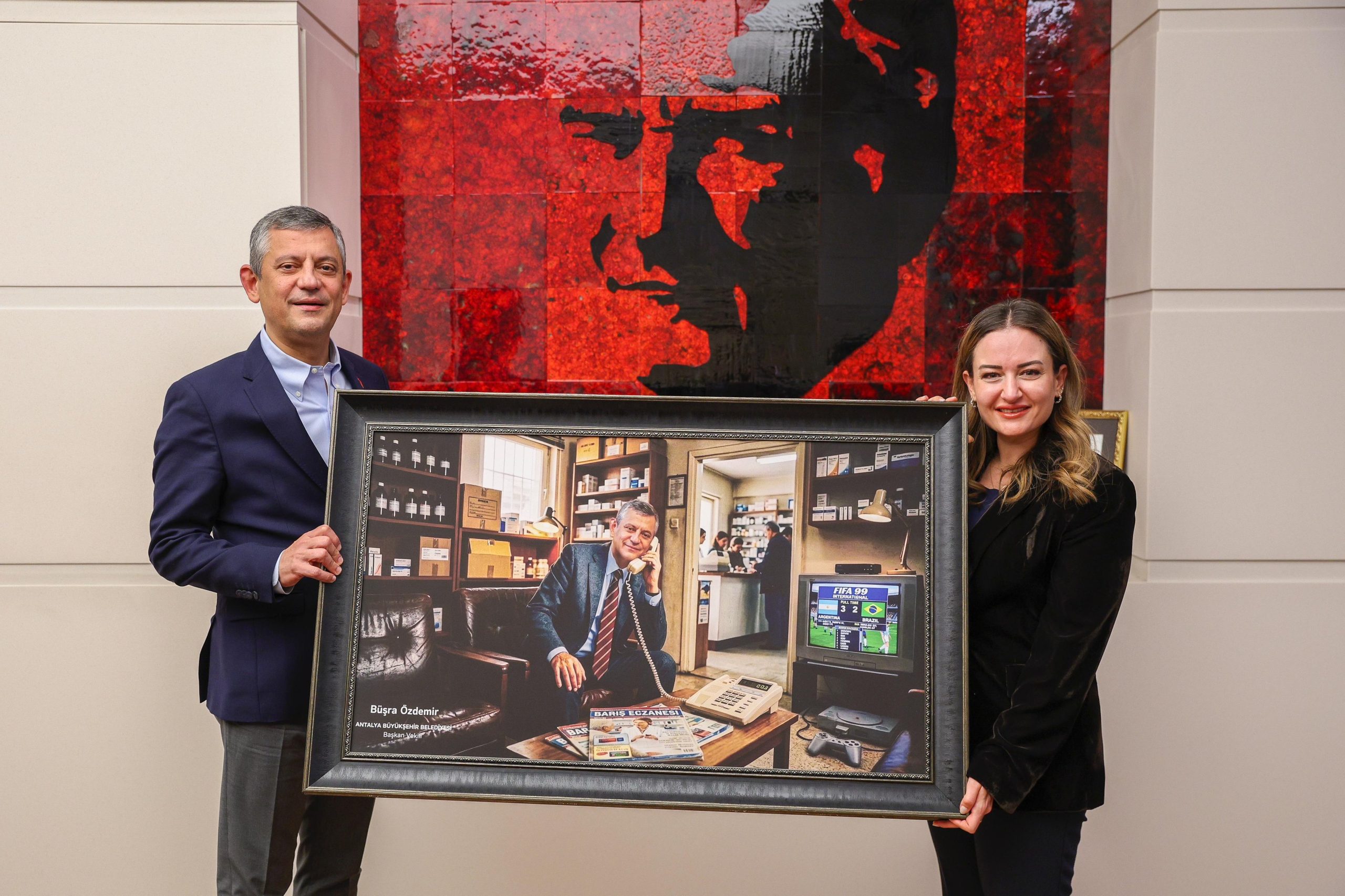 CHP Genel Başkanı Özgür Özel’i ziyaret eden Büyükşehir Belediyesi Başkanı Vekili Büşra Özdemir, Büyükşehir Belediyesi’nin Antalya’ya kazandırdığı hizmetler ve devam eden projeler hakkında bilgi verdi. Muhittin Böcek’in emeği ve mücadelesine vurgu yapan Başkan Vekili Büşra Özdemir, ziyaret anısına Özgür Özel’e bir tablo hediye etti. Başkan Vekili Özdemir, CHP lideri Özgür Özel’in siyasi kariyerinin başlangıcı ve eczacılık günlerini temsil eden bir fotoğraf görselinin güncel halini ifade eden tablo ile ilgili şu mesajı paylaştı: “Çünkü; o gün yarım kalan maç ile başlayan hikâye, bugün milletin iradesiyle tamamlanmaya devam ediyor.”