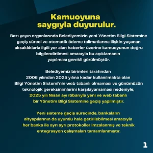 Belediye birimleri tarafından 2006 yılından bu yana kullanılan ve günümüz teknolojik ihtiyaçlarını karşılayamayan eski sistemin, 2025 yılı Nisan ayı itibarıyla web tabanlı yeni bir Yönetim Bilgi Sistemi ile değiştirildiği ifade edildi. Bu kapsamda bankalarla ayrı ayrı protokoller imzalanarak teknik entegrasyon çalışmalarının tamamlandığı bildirildi.