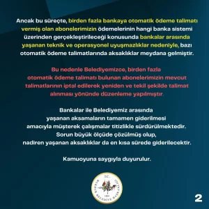 Bu durum üzerine Burdur Belediyesi’nin, birden fazla otomatik ödeme talimatı bulunan abonelerin mevcut talimatlarını iptal ederek, yeniden ve tek bir banka üzerinden talimat alınması yönünde düzenleme yaptığıaçıklandı.