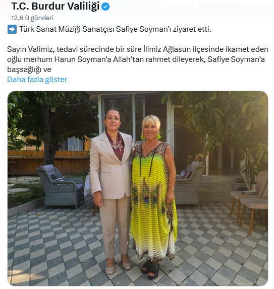 Burdur Valisi Tülay Baydar Bilgihan, Türk Sanat Müziği sanatçısı Safiye Soyman’ı ziyaret etti. Vali Bilgihan, tedavi sürecinde bir süre Ağlasun ilçesinde ikamet eden oğlu merhum Harun Soyman için Allah’tan rahmet..