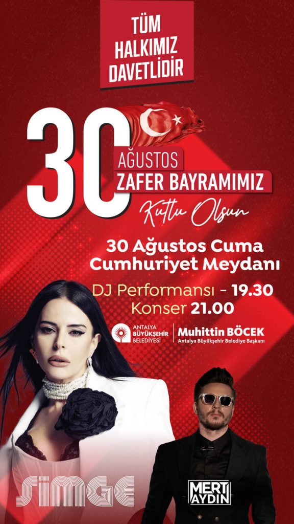Antalya Büyükşehir Belediyesi tarafından 30 Ağustos Zafer Bayramı kutlamaları kapsamında, ünlü şarkıcı Simge Sağın konseri düzenlenecek. Simge konseri öncesi 19.30’da Dj Mert Aydın sahne alacak. 21.00’da ise ünlü sanatçı Simge Sağın Antalyalılarla buluşarak Zafer bayramı konseri verecek. Konsere tüm Antalyalılar davetli.