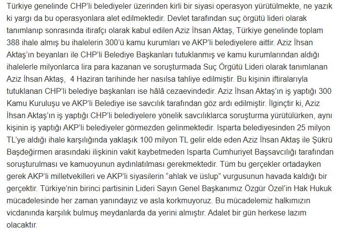 Komşu Isparta’da sular durulmuyor bu kapsamda bir açıklamada CHP Isparta İl Başkanı Hasan Karaca’dan geldi.