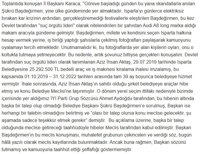 Cumhuriyeti Halk Partisi (CHP) Isparta İl Başkanı Hasan Karaca, Isparta Belediye Başkanı Şükrü Başdeğitmen’in,suç örgütü lideri olarak tanımlanan Aziz İhsan Aktaş ‘ın şirketleriyle yapılan ihaleler ve sonrasında yaşanan gelişmeler hakkında kamuoyunu bilgilendirme çağrısında bulundu.