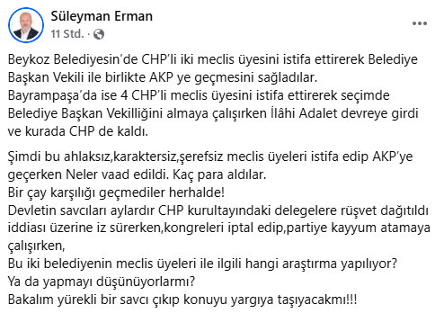 Burdur siyasetin deneyimli siyasetçi Süleyman Erman, İstanbul Bayrampaşa Belediyesi’ne yönelik yolsuzluk operasyonunun ardından 4 CHP’li meclis üyesi istifa etmişti bu CHP’li meclis üyerini sert bir dille eleştirdi ve “Şimdi bu ahlaksız, karaktersiz, şerefsiz meclis üyeleri istifa edip AKP’ye geçerken Neler vaad edildi.” Dedi.