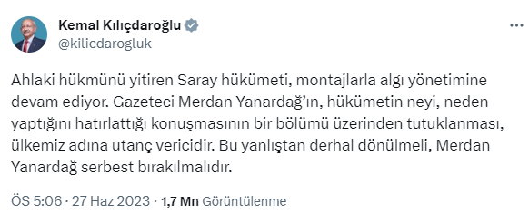 Kemal Kılıçdaroğlu: “Ahlaki hükmünü yitiren Saray hükümeti, montajlarla algı yönetimine devam ediyor. Gazeteci Merdan Yanardağ’ın, hükümetin neyi, neden yaptığını hatırlattığı konuşmasının bir bölümü üzerinden tutuklanması, ülkemiz adına utanç vericidir. Bu yanlıştan derhal dönülmeli, Merdan Yanardağ serbest bırakılmalıdır.”