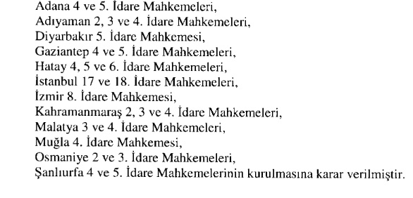 Adana, Adıyaman, Diyarbakır, Gaziantep, Hatay, İstanbul, İzmir, Kahramanmaraş, Malatya, Muğla, Osmaniye ve Şanlıurfa’da toplam 24 adet yeni idare mahkemesi kuruldu.